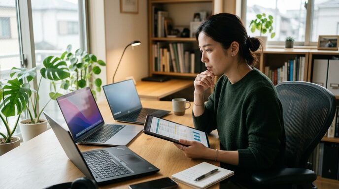 • ThinkPad X1 Carbonは整備済み品でも特に信頼性が高く、Gen 9は7〜8万円台、コスパ重視ならGen 8(4〜6万円台)も狙い目